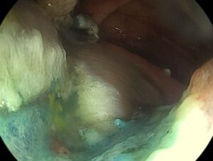 Η αφαίρεση πραγματοποιήθηκε τμηματικά (piecemeal) με βρόχο πολυπεκτομής, μετά από υποβλεννογόνια έγχυση μπλε μεθυλενίου (Blue Methylene).
